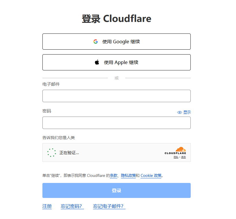 • 使用Apple也和Google一致,有账号可以直接登录,登录后Cloudflare将为您注册一个新的账户。